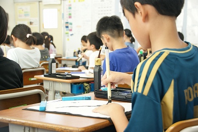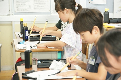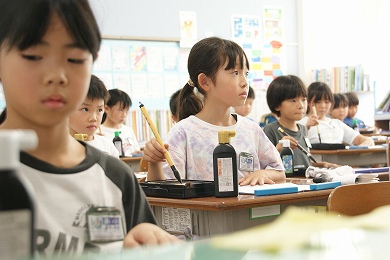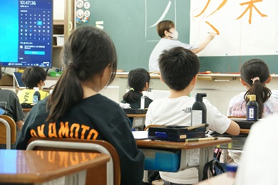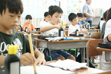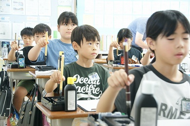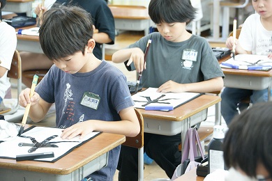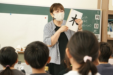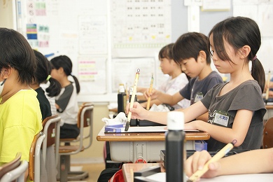 3年生の書写は、外部講師として書道家の花塚節子先生にお越しいただいています。この時間は、左払いと右払いの書き方のポイントを教えてもらい、練習しました。話をよく聞いているので、とても上手に書いていました。姿勢もいいですね!