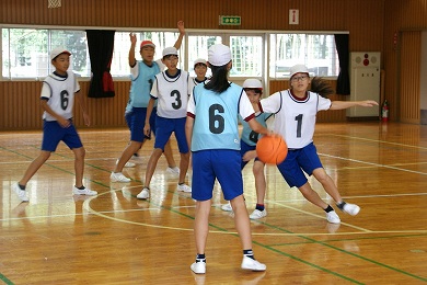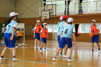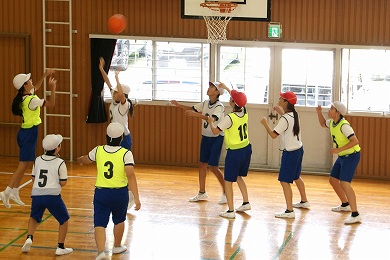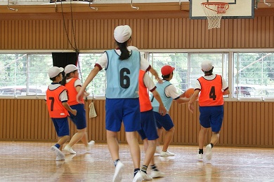 体育では、クラス全員がバスケットボールを楽しむことができるようにするため、プレイ上の制限などルールを工夫しながら学習を進めています。集団対集団の攻防に対し仲間と力を合わせて競い合ったりする楽しさや喜びを味わうことができる運動です。