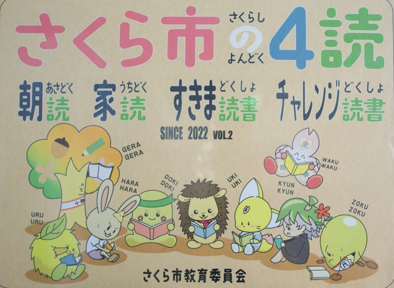 また、本市では、朝読(あさどく)・家読(うちどく)・すきま読書・チャレンジ読書を「さくら市の4読(よんどく)」として、読書活動を推奨しています。引き続き、本校でも図書委員会を中心に、図書ボランティアの皆様、読み聞かせボランティアの皆様のご理解とご協力をいただきながら、読書活動を推奨するとともに、本に親しむ児童の育成に努めてまいります。