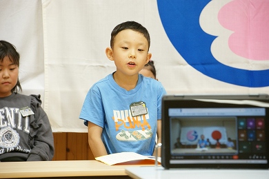 子供たちは、普段から「やさしい言葉」「元気が出る言葉」「相手のことを思っている言葉」「ニコニコ笑顔になる言葉」を使っています。そして子供たちは、広い世界ときれいな海を見た3匹のあおむしたちの会話の場面から、「一緒に、仲良く、さらに優しい気持ちになっていく様子」を感じ取っていたようです。
