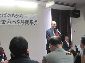 さくら市ミュージアム主催「ことばのちから―相田みつを展」開幕式に行ってきました。式では、主催者の加藤館長さんや特別協力者の“相田みつを美術館”相田一人館長さんなどのあいさつがありました。その中で、今回の特別展の開催までの苦労やさくら市とのゆかり等の話がありました。