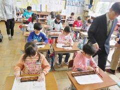 そろばん塾の先生方お二人による、「そろばん教室」を実施しました。そろばんに初めて触れる子たちがほとんどですが、テンポよい指導の流れに乗り、夢中になって玉をはじいていました。昨日、今日の2時間だけの授業ですが、「そろばんって楽しい!」「もっとやりたい!」と意欲的に取り組む姿が見られました。 (担当:榊原)