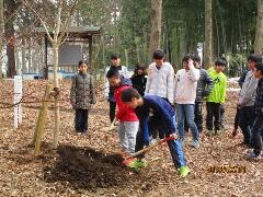 昨日ローソンの方ととちぎ環境・みどり推進機構の方を迎え、「学校環境モデル事業」の完成式典を行いました。この事業は、ローソンの各店舗にある募金の一部を活用させていただき、環境緑化の整備をするものです。南小では、「野外教室の整備」と「サザンカ・ヤマモミジ」の植樹を行いました。式典の後に環境委員の児童が記念の植樹や写真撮影をしました。今後綺麗に整備された野外教室で活用し学習することがとても楽しみな様子でした。 (担当:笠井)