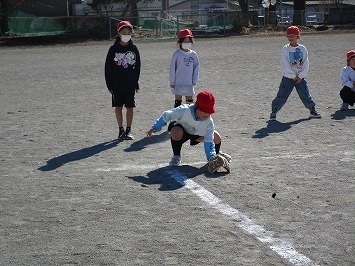 ティーボールやキャッチボールをしました。グローブを使うことが初めての子も、だんだん上手になりました。