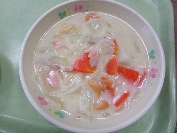 今日の給食は、6年1組子どもたちが英語の授業で考えたメニューです。マカロニのクリーム煮です。マカロニ(macaroni)、人参(carrot)、玉ねぎ(onion)、じゃがいも(potato)、ハム(ham)、具材たっぷりで栄養バランスもバッチリ!!6年1組のみなさん、栄養たっぷりなメニューを英語で考えてくれて、ありがとうございました。心も体もあたたまりました。