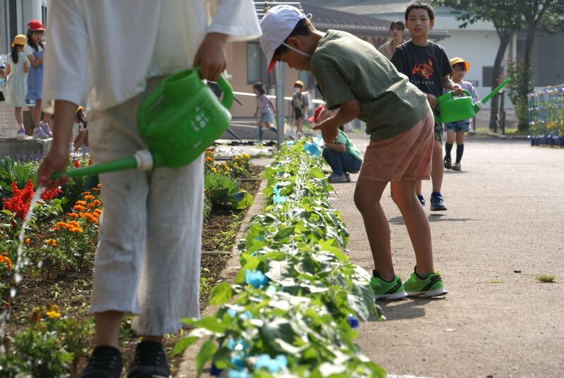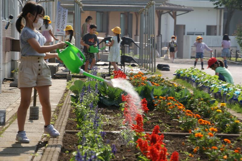 子供たちは登校後、花壇や植木鉢の土が乾いている様子を確認し、水やりをしています。南小の子供たちは、花や野菜などの植物を大切にする優しい心をもっています。すてきな空間ですね(*^_^*)