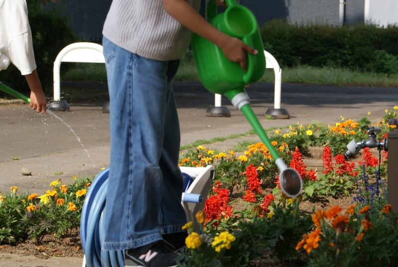 朝の様子「学校花壇や植木鉢への水やり」植物を大切しています