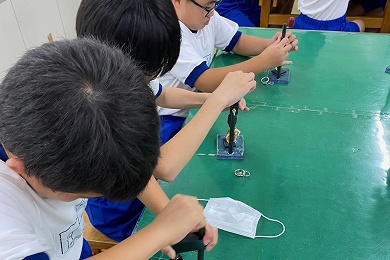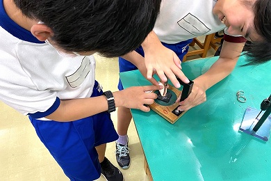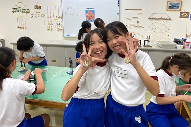 貝殻のキーホルダー作りは、固い殻に穴をあけてキーホルダーにします。いろいろな貝殻があるので、すぐに穴があくものや、なかなか穴があかないものがありますが、みんな熱心に取り組んでいました。思い出に残る手作り only one のキーホルダーができあがりました。