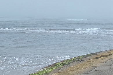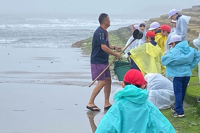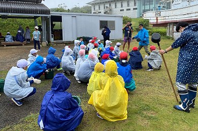 2日目(6月10日)の体験活動は、「塩づくり体験」です。あいにくの天気ではありますが、子供たちは、カッパを着て「塩作り体験」のスタートとなりました。まず、海水を汲みに海岸へ、・・・海水は先生が汲みました。
