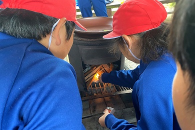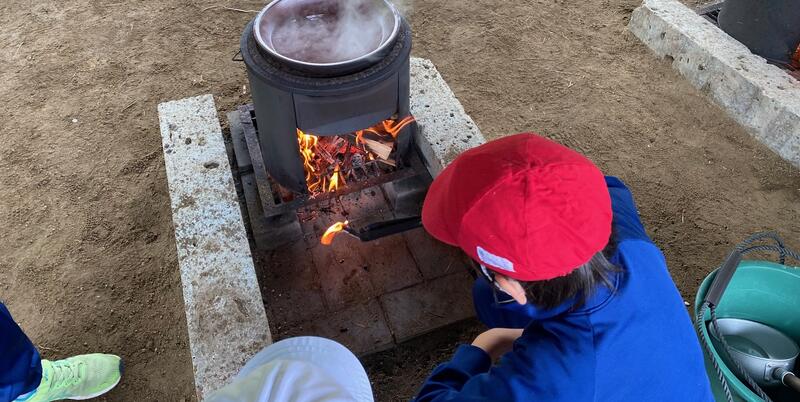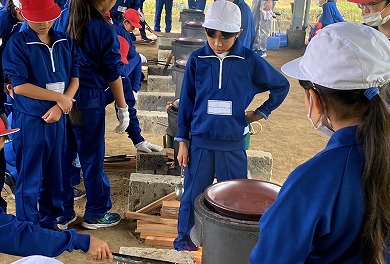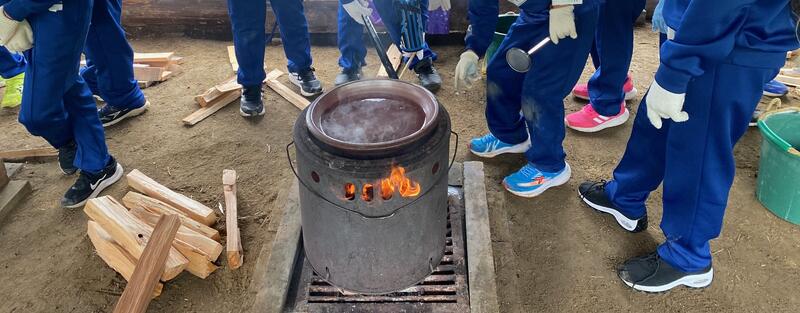 「塩づくり体験①」の続きです。美味しい塩をつくるため、かまどに火をつけ、汲んできた海水を煮詰めていきました。
