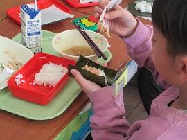 今日の給食は節分献立で、「セルフてまきずし」でした。
