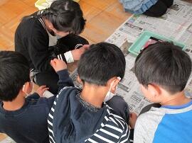 校内探険の後は、「まつぼっくり剣玉」作りです。