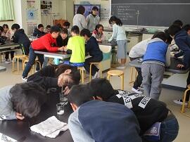 教室内にいた児童は、机やテーブルの下にもぐりました。