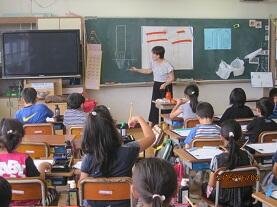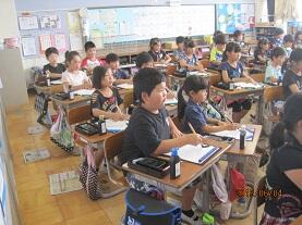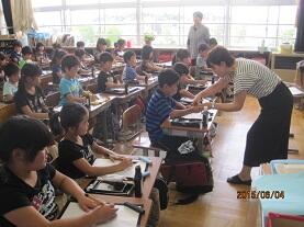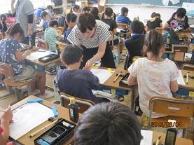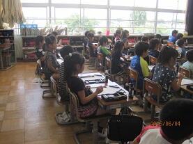 6月4日(木)2・3校時には3年生「書写」の授業(2回目)に、花塚先生が授業支援に見えました。まず、前回の復習から行い、毛筆の姿勢・筆の持ち方、用具の置き方・扱い方を確認しました。そして「横画」の復習をした後、今回は「横画の仕上げ」で『二』を清書しました。今回も、始筆・送筆・終筆について丁寧にご指導いただきました。