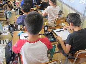 3年生の教室に入ると、墨汁の香りが漂い、気持ちが落ち着くようなアロマな感じがしました。そんな中、子どもたちは真剣に取り組んでいました。