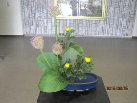 今回は、ネギボウズのような「ギガンチューム」と夏の季節に涼しげな色で咲く「ギボウシ」、そして「小ギク」を生けてくださいました。