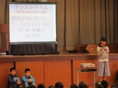 今日は、運動委員会の発表でした。運動委員会では、11月15日に行われる校内持久走大会について説明がありました。そして、来週からマッスルタイムが始まります。運動委員会から、手作りのカードが配られます。カードが終了すると校長先生から手作りの完走証がいただけます。みんな張り切ってチャレンジしてくれることと思います。