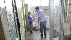 今日はアルミ缶回収日です。アルミ缶を大切に持って、足早にあいさつして過ぎていきます。