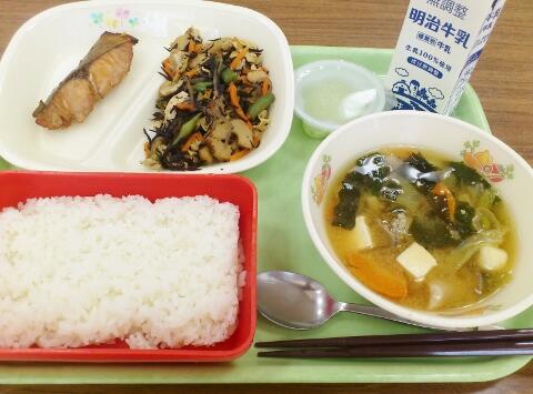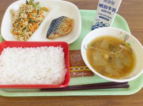 今日の「満点味噌汁」についてです。9月18日月曜日は、敬老の日ですね。今日は、その日にちなんで長寿献立となっています。みなさん、「まごわやさしい」という言葉を知ってますか。これは、昔から日本にある健康食材のゴロあわせです。「ま」は、豆から大豆製品。「ご」は、ゴマやナッツ類。「わ」は、ワカメなどの海藻類。「や」は、野菜類や根菜類など。「さ」は、魚類で、小魚や貝類。「し」は、シイタケからきのこ類。「い」は、芋類、里芋、かぼちゃなどです。今日のみそ汁はこの「まごがやさいし」食材を取り入れた、栄養満点のみそ汁です。どんな食材が入っているか、確認しながら味わってください。