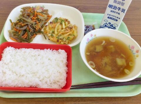 「ゴーヤチャンプル」は、沖縄県で生まれた料理です。チャンプルというのは、炒め物という意味です。ゴーヤ(にがうり)は、苦くて苦手なお子さんもいるかと思いますが、今日は塩でもんだ後ボイルして、苦みを抑えてあります。給食室では、食べやすく毎日工夫をしています。
