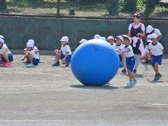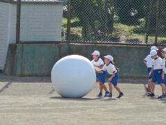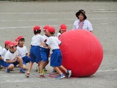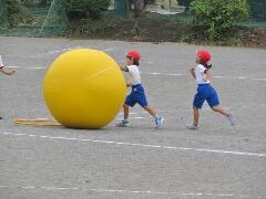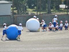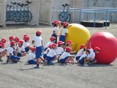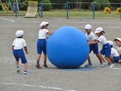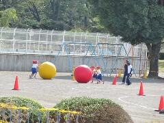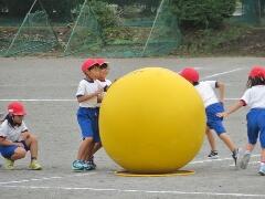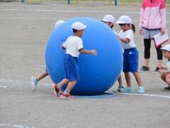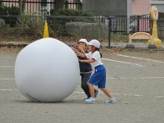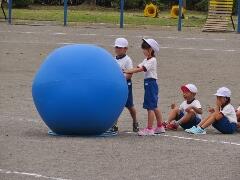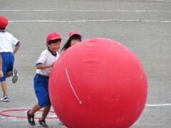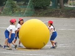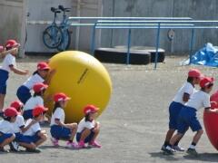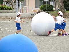 自分の背丈より大きな赤・黄・白・青の大玉を、一生懸命に転がしています。