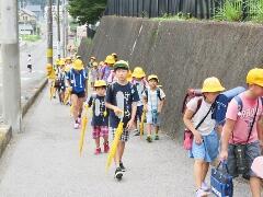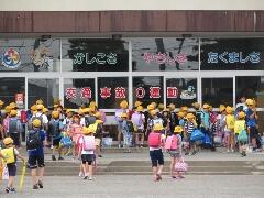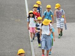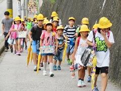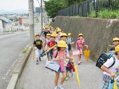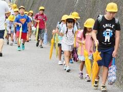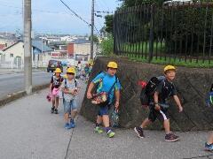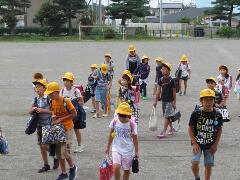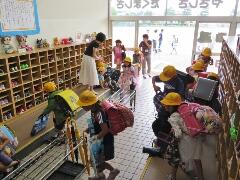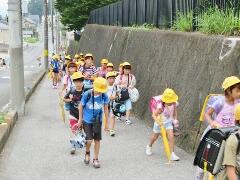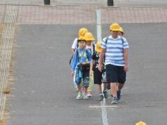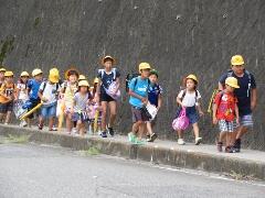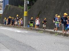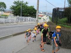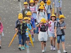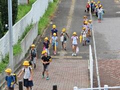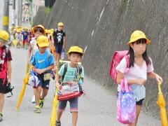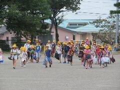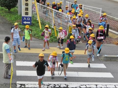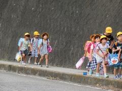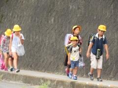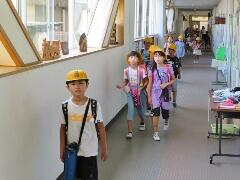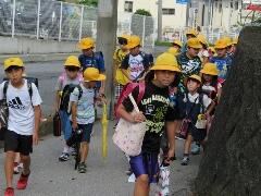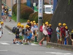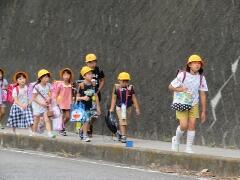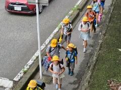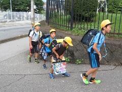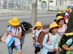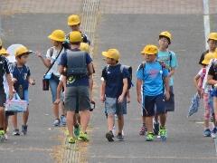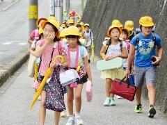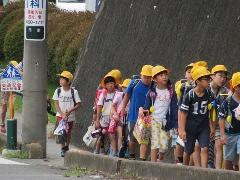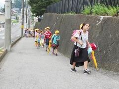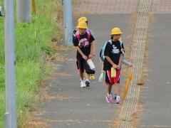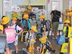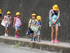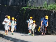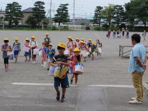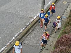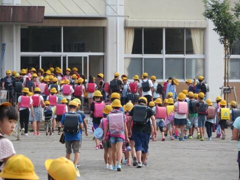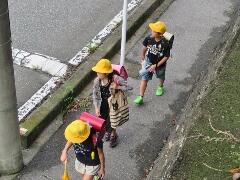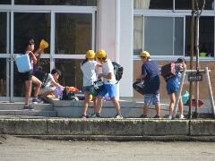子どもたちは、荷物をたくさん持って元気に登校してきました。
