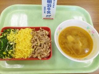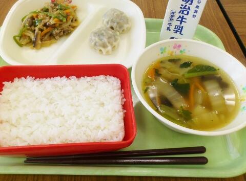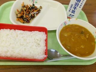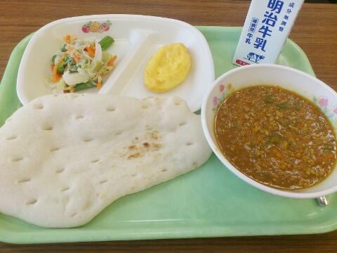 今日は、「インド料理」です?ナンはインドやイラン、ウズベキスタンなど、中近東の国で食べられています。ペルシャ語で「パン」という意味だそうです。小麦粉を水で練り、天然酵母で発酵させた生地をのばし、タンドゥールと呼ばれる、つぼの形をした釜の内側にはりつけて焼きます。ナンの形は、平べったくて、なすやひょうたんやぞうりみたいな形をしています。今日はナンをちぎって、ドライカレーにつけて食べました。ナンが温かいと、さらにおいしいのですが・・・でも、学校給食で「ナン」が食べられる幸せをかみしめた献立でした。