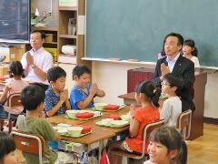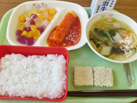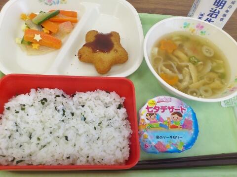 今日は「七夕メニュー」です。七夕は、天の川の両方にいるひこ星と織り姫が年に1度会う、お話が中国から伝わったと言われています。今日の給食献立では、夜空の輝く星にちなんで、星型コロッケ、そうめんを天の川に見立てた七夕汁、野菜を短冊切りした短冊サラダ、そして、デザートにソーダー味の七夕ゼリーが出ます。