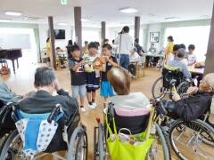 歌やリコーダー演奏を披露した後、グループごとに作成したメッセージカードをおじいさんやおばあさんにプレゼントしました。