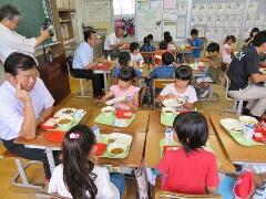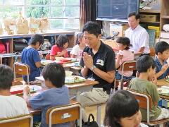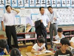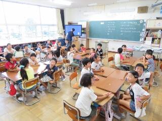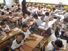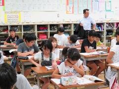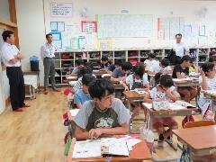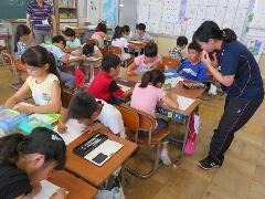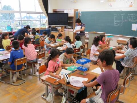 3年生の理科の授業の様子です。グループごとに、学校で捕まえてきた生き物を細かに観察しました。二人の先生がチームを組んで指導をしています。きめ細かな授業が展開されていました。