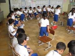 5年生は、1組は体験入学とのお友達とのお別れの準備を、2組は外で元気にドッチボールを行いました。