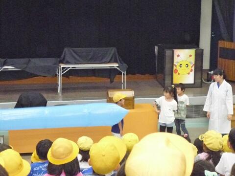 5月24日。遠足で、子ども総合科学館に行ってきました。宇宙やエネルギーなどの展示場や暗闇や斜めの部屋をグループごとに体験しました。またプラネタリウムで星を見たり、サイエンスショーで空気と光の実験を体験したりと楽しく科学の世界に触れることができました。