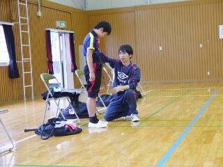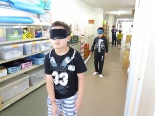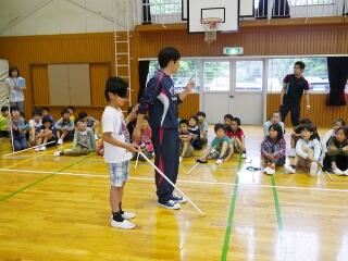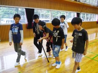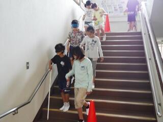 アイマスク・白杖体験では、普段歩きなれた体育館や階段でも不安に感じること、介助する時には肩や肘をもってもらうこと、曲がる時や段差がある時には声をかけてあげると安心することを学びました。