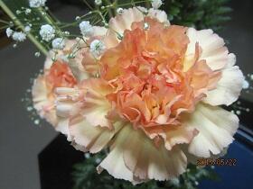 5月22日の午後、生け花ボランティアの方が見え、いつものようにお花を生けてくださいました。玄関には、「カーネーション」と「カスミ草」そして、「ニューサイラン」と「レザーファン」を生けてくださいました。