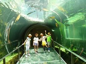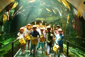 「アマゾン大水槽」では、水槽をつらぬくトンネルの中で、頭上を泳ぐ巨大魚や足下にひそむ巨大ナマズなどの迫力に大賑わいでした。