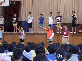 今回はあいさつ・集会委員会の企画で「1年生から6年生まで、楽しく交流しよう!」というねらいで『猛獣狩りに行こう!』を行いました。あいさつ・集会委員のメンバーが進行し、ステージ上では“デモンストレーション”を行うなど、低学年の児童にも分かりやすく、みんなで楽しみながら1年生を歓迎する気持ちが会場にあふれた素敵な集会でした。