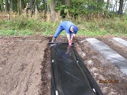 この日は、更に中村さんと吉澤さんのボランティアさんも加わり、3人の指導を受けながら、2人で1本の苗を植え付けました。マルチの穴にそっと植え、支柱の篠にひもを8の字に結んで固定する方法を教えていただきました。