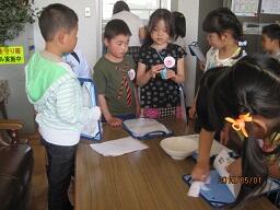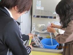 教頭先生と理科支援員の舩生先生が、2Lペットボトルの容器の上のほうにカッターで、親指が入るぐらいの穴を開け、誘引剤(酒・酢・砂糖を混ぜ合わせたもの)を5cmくらい溜まるように入れ、ふたを閉めて完成です。