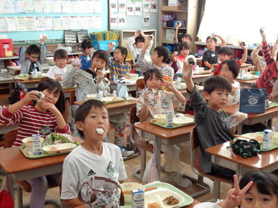 「からげ3個入れてきた!!」「お弁当が楽しみ!」登校中の子どもたちの会話です。