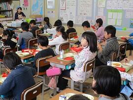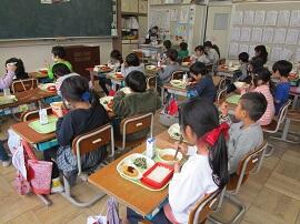 給食はいつものグループではなく、全員が前を向いて食べています。