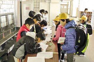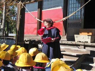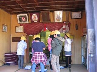 総合的な学習の調べ学習のため、学校ボランティアの松田さんに案内していただき、将軍地蔵から高尾神社、大日堂、与作稲荷神社、船玉神社、浮島地蔵等上阿久津方面にある神社を巡ってきました。今回は特別に彫刻屋台も見学させていただきました。それぞれの場所で松田さんに説明をいただき、子ども達は奉納された絵馬やお地蔵様などを熱心に見てまわりました。とても貴重な場所にも入らせていただき、有意義な学習ができました。
