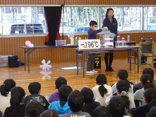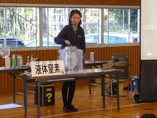 液体窒素を使って身近にある様々な物を冷やす実験を繰り返されました。ペットボトルの中で膨らんでいく風船、パリンと割れてしまったボール、白い粉になってしまった二酸化炭素(ドライアイスになった)なでです。クイズ形式で予想をしてはみたものの、ことごとく驚く結果となり、「わぁー」という声が何度も上がりました。次は、「なに?何?」と、わくわくして見ているうちにあっという間の40分でした。普段の授業では見られないことに、とても楽しめた超低温の世界でした。 (担当:塚原)