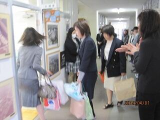辞令交付式を終えた新任の先生方を迎え入れる準備を整え、玄関では全職員が拍手で迎えました。今回の定期異動により本校にも10名の転入職員と1名の育児休業からの復帰者、更に内部昇格者を含め12名の新しい息吹が吹き込まれました。