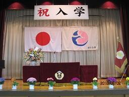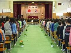 新入生は少し緊張しているようでしたが、トトロの散歩の曲に合わせて担任と6年生の誘導で入場し、式が始まりました。担任の先生からの“入学児童呼名”では、学校長の確認にしっかりと視線を合わせて返事をしている新入生も数多くいたり、「お迎えの言葉」の呼びかけに、きちんと「よろしくお願いします。」と言葉を返すことができたりするなど立派な態度でした。また、2年生から6年生の児童も上級生らしく、式の最後の校歌では新入生を後押しするような元気はつらつの歌声で、すばらしい態度で式に臨めていました。