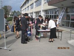 4月10日、若干肌寒さが残る中ですが、春らしい穏やかな陽射しに恵まれ、新入生は保護者に手を引かれながら昇降口前で所属学級の確認を行った後、受付をして教室に入って行きました。
