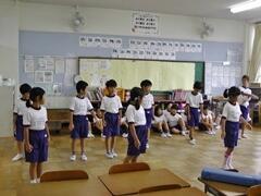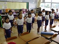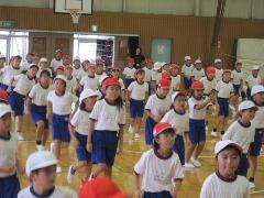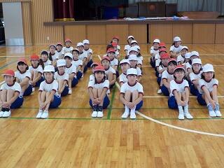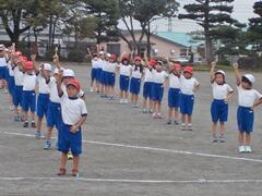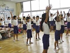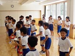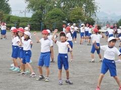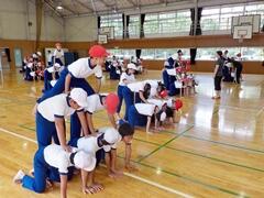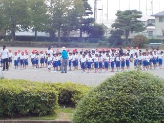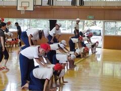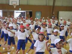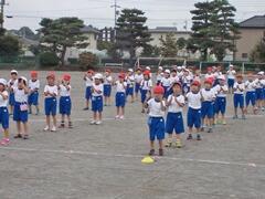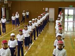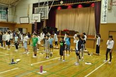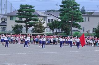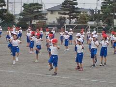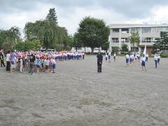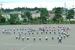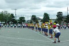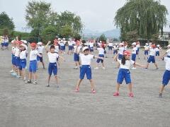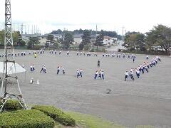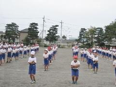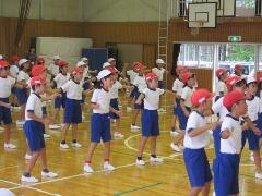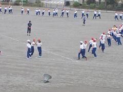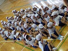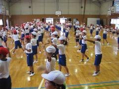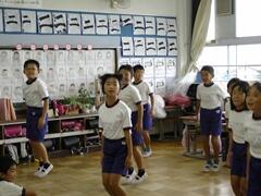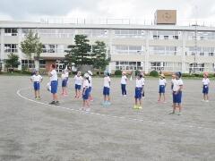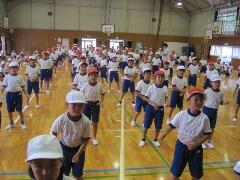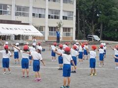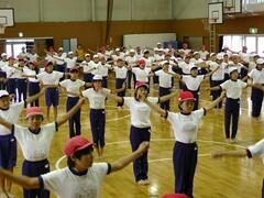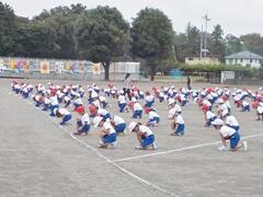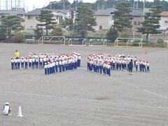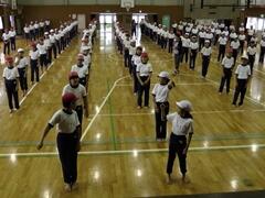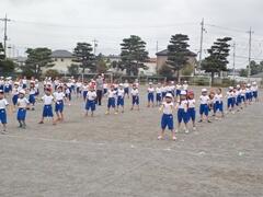 今日の業間の時間の運動全体練習は、「ラジオ体操」を行いました。基準になる児童を中心に、きれいに体操の隊形に開けました。ラジオ体操も演技種目の一つです。