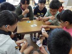 身近な学習用品を、英語に言い換えて「かるた」とりのような形で楽しくペアで取り合っていました。