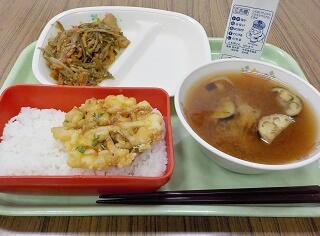 海鮮かき揚げ・茎わかめのきんぴら・豆腐とエノキの味噌汁 688kcal