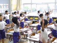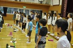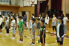 今日は雨天のため、校庭に一堂を会しての全体練習はできませんでしたが、教室や体育館に分散して練習を行いました。体育主任が、校内放送を利用して「ラジオ体操」「運動会の歌」「校歌」の練習を、リアルタイムで短時間に効果的に行いました。