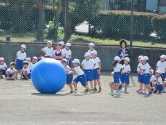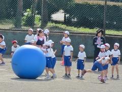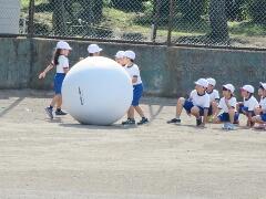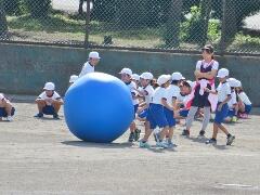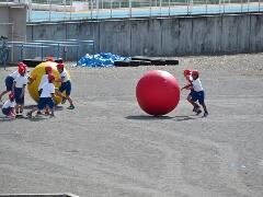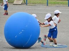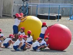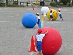 自分の背丈より大きな赤・黄・白・青の大玉を、一生懸命に転がしています。